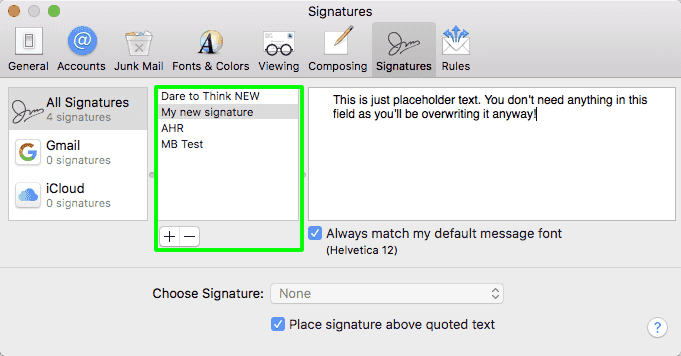 Give your new signature a title and leave it at that (you don’t need to enter any text in the third (content) column, as you’ll be replacing this content later). Drag the signature (from the second column) on top of the email account you would like it to be associated with.